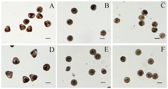Micrographs of P. lividus embryos after 24 h of treatment with cyanobacteria extracts. (A) Control sample; (B,C) sea urchin embryos treated with aqueous extracts from Cyanobium sp. ITAC108 and Synechococcus sp. ITAC107, respectively; (D) sea urchin embryos treated with hexane extracts from Synechococcus sp. ITAC107; (E,F) sea urchin embryos treated with methanolic extracts from Cyanobium sp. ITAC108 and Synechococcus sp. ITAC107, respectively. Bar represents 100 µm.