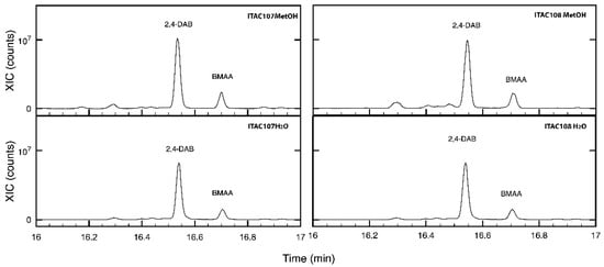 Both the methanolic and water extracts from Cyanobium sp. ITAC108 and Synechococcus sp. ITAC107 were analyzed by GC-MS to identify those metabolites responsible for the toxicity of extracts. The β-N-methylamino-l-alanine, BMAA, was identified in the chromatograms of the methanolic extract at 16.71 min as tms derivates using the accurate mass 116.0889 and 291.1263. The relevant extracted ion chromatograms of all the samples are shown in Figure 6, where it is possible to observe, along with BMAA, the presence of 2,4-diaminobutyric acid (2,4-DAB), which also has neurotoxic properties [].