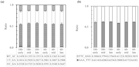 16S rRNA types of strain w15 (a) ratio of T_AC (grey)/T_GA (blank)/C_GA (zebra lines) at V2 region, and (b) ratio of TTC_GGG (blank)/AAA_TTT (grey) at V3 region. 180: samples from 180 rpm shake cultures; 60: samples from 60 rpm cultures; early: 24 h; mid: 5 days; late: 13 days.