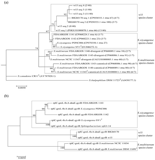 Phylogenetic tree of strain w15, BIGb0170, S. multivorum NCTC 11343T, S. siyangense SY1T and related species, based on (a) 16S rRNA and (b) five concatenated core genes (rplC, groL, ftsA, dnaE, gyrB).