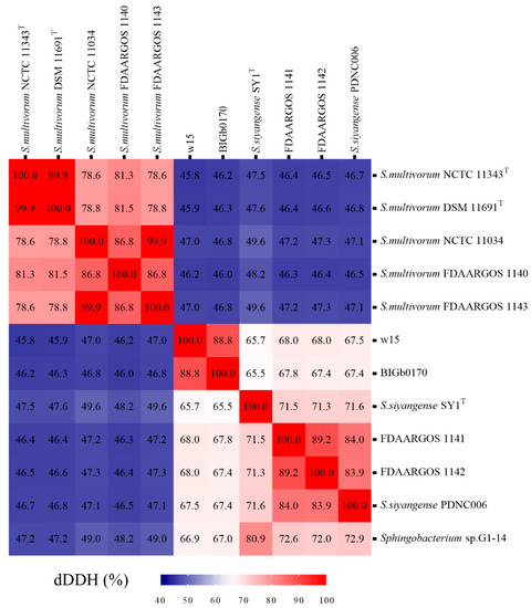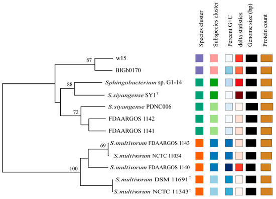 To shed light on the nature of the association of strain w15 with the species S. multivorum, key genome features were first examined. As comparators, the genomes of two S. siyangense strains (SY1T; PDNC006) and one Sphingobacterium sp., GI-14, were also examined (Table 1). All S. multivorum strain genomes (NCTC 11343T; NCTC 11034; DSM 11691T; FDAARGOS 1140; FDAARGOS 1143) showed G+C% of 40.0–40.1%, genome sizes of 5.7–6.0 Mbp, and had totals of 4879–5310 identifiable genes. The S. siyangense strains (SY1T; PDNC006) showed G+C% of 39.8%, genome sizes of 6.3–6.8 Mbp, and had totals of 5482–5741 identifiable genes. Regarding the genome features, strain w15 had a G+C% of 39.8%, a genome size of 6.68 Mbp, with a total of 5541 identifiable genes. Interestingly, it was very akin to a recently described strain, BIGb0170, which revealed a G+C% of 39.9%, a genome size of 6.43 Mbp, and a total of 5348 genes.