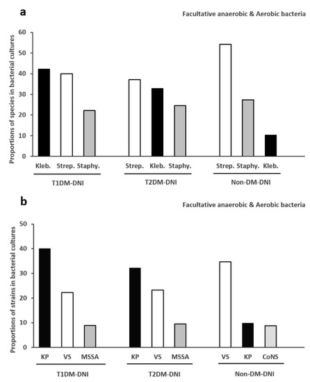 Figure 2. (a): Top three species of facultative anaerobes and aerobes in T1DM-DNI, T2DM-DNI, and non-DM-DNI. (b): Top three bacteria of facultative anaerobes and aerobes in T1DM-DNI, T2DM-DNI, and non-DM-DNI. Abbreviations: Kleb., Klebsiella species; Strep., Streptococcus species; Staphy., Staphylococcus species. KP, Klebsiella pneumoniae; VS, Viridians Streptococci; MSSA, methicillin-sensitive Staphylococcus aureus; CoNS, coagulase-negative Staphylococcus. DNI, deep neck infection; T1DM, type 1 diabetes mellitus; T2DM, type 2 diabetes mellitus.