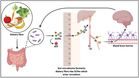 The gut-brain-axis showing the bidirectional relationship between the gut microbiome and the nervous system. The gut microorganisms ferment dietary fibre which produces SCFAs. The SCFAs are proposed to enter the circulatory system and into the brain via the blood brain barrier.
