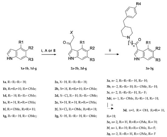 Specifically, the acetylation of the appropriate indole derivatives (1a–b, 1d–g) was carried out by using N,N-dimethyl acetamide (DMA) or N,N-dimethylchloroacetamide (pathway i, A or B, respectively) and phosphorus oxychloride (POCl3), which afforded the corresponding intermediates 2a–b and 2d–g. The intermediates 2a–b, 2e and 2g reacted with the suitable cycloalkylamines in the presence of paraformaldehyde and under microwave irradiation to produce the desired compounds 3a–3b, 3e and 3g in high yields. Alternatively, the 2-chloro-1-(1H-indol-3-yl)ethan-1-one derivatives 2d and 2f were converted to the corresponding compounds 3di and 3f by coupling with the suitable benzylpiperidine derivatives. Finally, the demethylation of the methoxy group of the pioneer compound 3di was performed using boron tribromide (BBr3) to yield the hydroxyindole derivative 3d.