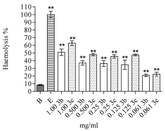 The cytotoxicity of the two most promising compounds was analysed by checking haemolytic activity against human red blood cells. The lysis percentage was evaluated by comparing the absorbances of each sample to the sample treated with distilled water to obtain the complete erythrocytes haemolysis (Figure 2). The positive control showed about 100% lysis (E), whereas the spontaneous haemolysis was ~7% (B). Compounds 3b and 3c were also analysed for potential haemolytic activity on erythrocytes. As reported in Figure 2, the incubation of erythrocytes with the tested compounds resulted in a haemolytic activity ranging from ~20% (for the lowest concentration tested) to ~60% (for the highest one) for both compounds.