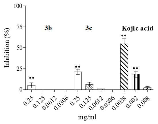 In order to shed some light on the possible mechanisms of action of the compounds, we performed a partial purification of tyrosinase from the tested microorganisms and evaluated the inhibitory effects of the most promising compounds (3b and 3c) at the concentrations of the experimental obtained MIC. The results showed an inhibition of the microorganism enzyme of up to about 28%, which may be, in part, responsible for the observed antimicrobial effects. As reported in Figure 3, compound 3c was able to inhibit the enzyme up to ~28% at the maximum tested concentration of 0.250 mg/mL, whereas the inhibitory effects were clearly less evident at lower concentrations. On the other hand, compound 3b was only able to perform a slight inhibition at the maximum tested concentration.