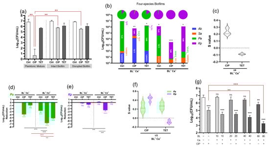3.3. BL-Ca Dual Treatment Potentiates Anti-Biofilm Activities of Ciprofloxacin and Reshapes the Biofilm Community
