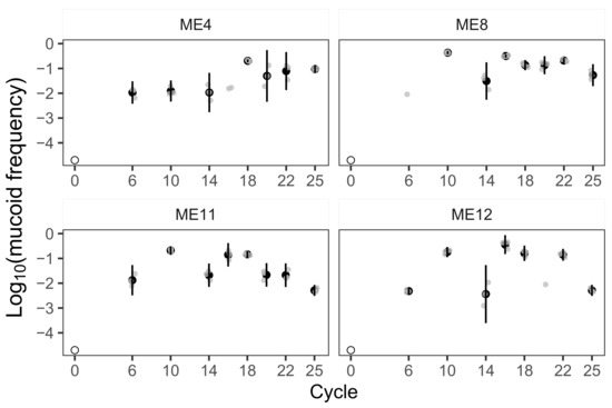 3.1. Mucoid Phenotypes Rise to and Remain within Intermediate Frequency Ranges