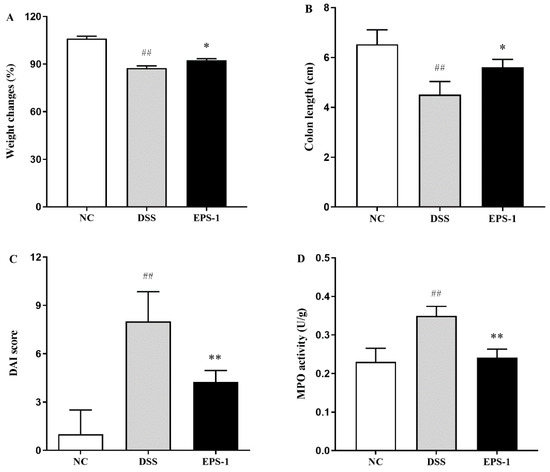 3.1. Effect of EPS-1 Administration on the DSS-Induced Colitis in Mice