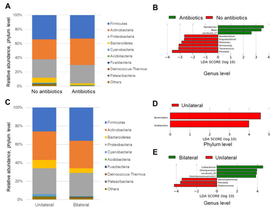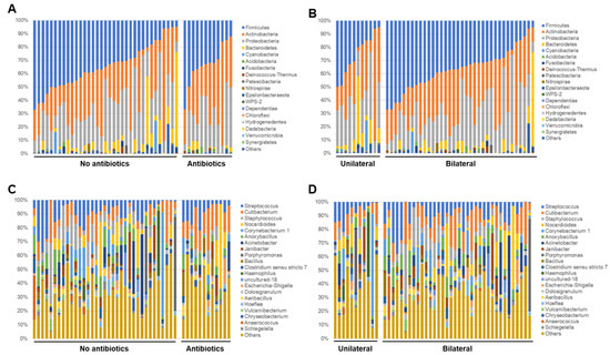 Next, the relative abundance of each sample at phylum and genus levels were analyzed and compared based on the information about the use of antibiotics and laterality. In the analysis of the phylum level, significant findings were not observed between the groups for the use of antibiotics (Figure 5A), however, for the laterality, samples in the bilateral group seemed to be relatively rich in Firmicutes rather than the unilateral group (Figure 5B). In the analysis of representative genera (which had at least 50,000 reads in this study), Streptococcus, Cutibacterium, and Staphylococcus genera were observed in most of samples. Samples with unique genera with high abundance, such as Porphylomonas, Haemophilus, Corynebacterium, Acinetobacter, Janibacter, and Anaerococcus were also observed (Figure 5C,D).