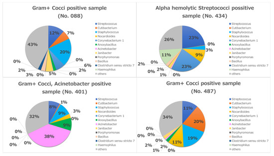 In case No. 401, the most abundant bacterium in the metagenome result was Acinetobacter (38%), which was congruent with the conjunctival cultivation result (Figure 7). In the other three cases (No. 008, 434, 487), the most abundant bacteria were Streptococci and Staphylococci in the metagenome, which were also congruent with the conjunctival cultivation results (Figure 7).