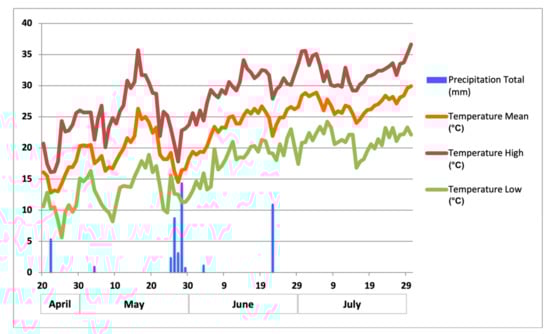 The weather conditions (daily mean, high and low temperature, and precipitation) during the experimental period were retrieved from the NOANN network of the National Observatory of Athens [22].