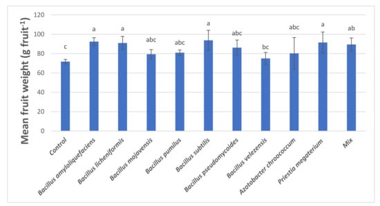 The use of PGPB increased the mean fruit weight of tomatoes at the harvest (Figure 2). The treatment of B. subtilis (93.77 g fruit−1) gave the highest weight, followed by B. amyloliquefaciens (92.41 g fruit−1), Priestia megaterium (91.49 g fruit−1), and B. licheniformis (90.95 g fruit−1) with statistically significant differences compared to control. Moreover, the treatment of Mix (89.40 g fruit−1) was statistically significantly different compared to that of control, while the rest of the PGPB treatments, although all of them presented higher values of the control, their differences were statistically nonsignificant.