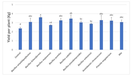The soil application of PGPB on tomato processing plants resulted in yield increase per plant for all studied treatments, except B. mojavensis, with statistically significant differences compared to that of control (Figure 3). The treatment of B. licheniformis (3.60 kg) led to the highest yield, followed by B. subtilis (3.45 kg). The treatments of Bacillus amyloliquefaciens (3.09 kg), Bacillus pumilus (3.26 kg), Bacillus pseudomycoides (3.04 kg), Bacillus velezensis (2.89 kg), Azotobacter chroococcum (3.29 kg), Priestia megaterium (3.23 kg), and Mix (3.07 kg), had higher yield compared to that of control (2.37 kg), with statistically significant differences, but the differences were nonsignificant among them.