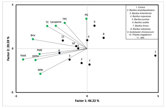 One-way analysis of variance (ANOVA) was used to evaluate the effect of PGPB application. The experimental data were analyzed using IBM SPSS software ver. 24 (IBM Corp., Armonk, NY, USA). PCA is a dimensionality-reduction method that is often used to reduce the dimensionality of large data sets by transforming these huge set of variables into a smaller one that still contains the accurate information. By computing the eigenvector allow to find the principal components that are in significance. In this point of view, in this study, it was necessary to normalize data before performing PCA. Nine parameters were set (Yield, MW, PME, PG, Brix, Yield, TPC, TC, Lycopene), making the analysis of their data much easier when correlating samples with variables. The comparisons of means were calculated using Duncan test at the 5% level of significance (p ≤ 0.05). Multivariate analysis was conducted by means of principal component analysis (PCA) by using STATISTICA 7 (Statsoft Inc., Tulsa, OK, USA).