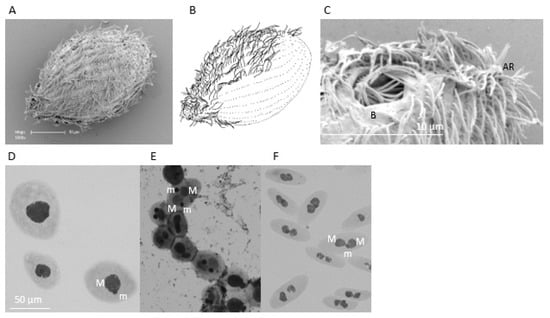 (A) Scanning electron micrograph and (B) line drawing of T. rostrata TRAUS showing a trophont with 28 rows of cilia and a tapered rostrum; (C) scanning electron micrograph of the buccal opening (B) and anterior rostrum (AR); Giemsa stained (D) trophonts, (E) cysts and (F) theronts showing macronuclei (M) and micronuclei (m).