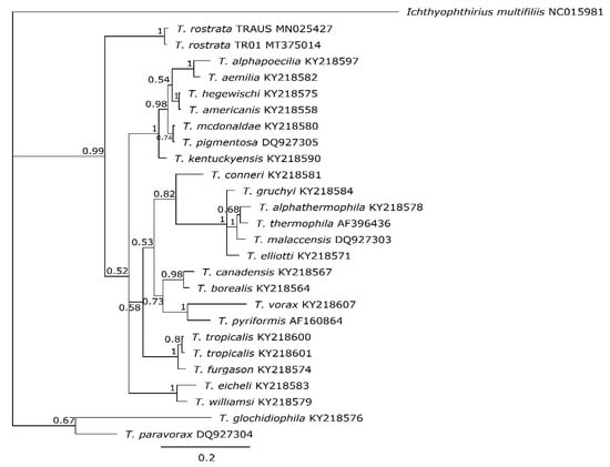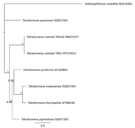 Phylogenetic tree of Tetrahymena based on the mtSSUrRNA, 541 bp right-hand region of TRAUS, TR01 and other Tetrahymena species. The MrBayes tree was built in Geneious Prime v.1.2 using a 1,100,000-generation chain length and a 1,000,000-generation burn-in with Ichthyophthirius multifiliis as an out group. Posterior probability values are shown to indicate branch support.