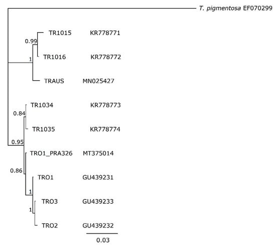 Comparison of the available reported sequences of 1796 nucleotides for the cox1 gene of T. rostrata isolates is shown in Figure 4. The phylogenetic analysis shows that the sequences group into two clades. Sequences of TRAUS, TR1015 and TR1016 cluster together. The genetic distances between TRAUS and TR1015 and TR1016 were 1.52 and 1.07 respectively. The sequences of the other Spanish and Polish isolates clustered together as previously reported []. There was no discrimination dependant on the host animal or geographic origin of the isolates. The cox1 sequence previously deposited in Genbank for TR01 is included (GU439231). There were 13 SNP differences between the cox1 of TR01 entered into Genbank in 2016 [] and TR01 (ATCCPRA326) (MT375014) as examined by us. The Illumina reads across the TR01 (ATCCPRA326) cox1 gene are homogeneous indicating that the template is clonal. The most likely reason for the discrepancy is that the TRO1 cox1 GU439231 was derived from DNA extracted from a T. rostrata culture that was not clonal, as indicated in Segade et al., 2009 [], but the material deposited at ATCC is clonal. The cox1 sequence of TR01 (GU439231) and TR01_PRA326 (MT375014) agree over the first 1064 bases of common sequence. Indeed, TR02 and TR03 sequences are also the same over this region which covers the barcode region (nt 220-908, MT375014). The 18S sequence did not differ between TR01 (JQ 045342), TR01 (ATCCPRA326) and TRAUS. Comparison of each protein coding DNA sequence showed that there was a high level of conservation across the mitogenomes. There were no particular hotspots of nucleotide substitutions or indels that might indicate genetic drift.