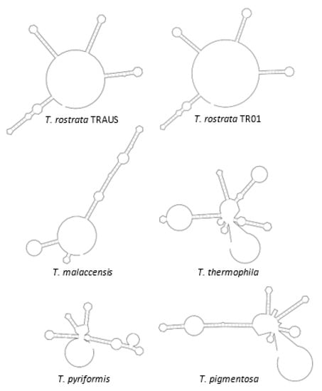 Doerder [] highlighted the use of the mtSSUrRNA for species identification where there are multiple isolates available. Doerder found that the “left” and “right” region of the mtSSUrRNA were highly variable and that the right region was represented by more strains in GenBank. The right mtSSUrRNA region was analysed for its potential ability to provide clarity around complex species. The two T. rostrata mtSSUrRNA have 2 SNP differences (1 transition and 1 transversion) indicating a low sequence divergence (2.7%). Both isolates had identical V4 regions (TRAUS nt847-1008; TR01 nt848-1009). A phylogenetic tree of the mtSSUrRNA sequences shows TR01 and TRAUS on a separate branch from other Tetrahymena (Figure 6). Intra-species variability has been found in some other Tetrahymena species []. In this case, we are able to compare the whole mtSSU genes of the two isolates. Overall, there are 18 SNP differences in the 1431 nt gene and 8 of the SNPs are focused in a 22–25 nt hypervariable domain. The differences are one 3 nt insertion (TTT), 3 transversions and 2 transitions. This region (TR01 nt1283-1304) may be particularly useful for examining diversity in species complexes. It is situated 3′ to the region most commonly available in Genbank which was used in recent Tetrahymena phylogenies which revealed many new species []