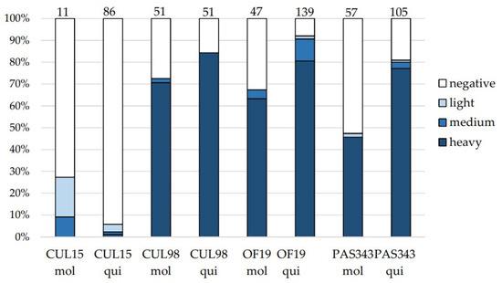 Infection rates and intensities of infection in mosquitoes Culex molestus (mol) and Culex quinquefasciatus (qui) experimentally infected with Trypanosoma thomasbancrofti strains CUL15, CUL98, OF19, and PAS343. Infection intensities: light, 1–100 parasites; medium, 100–1000 parasites; heavy, >1000 parasites per gut. Numbers of dissected females are presented above the columns.
