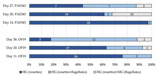 Changes of trypanosome localization in Cx. quinquefasciatus guts experimentally infected with isolate OF19 and PAS343. The numbers of dissected females are shown in the columns. HG, hindgut; MG, midgut.
