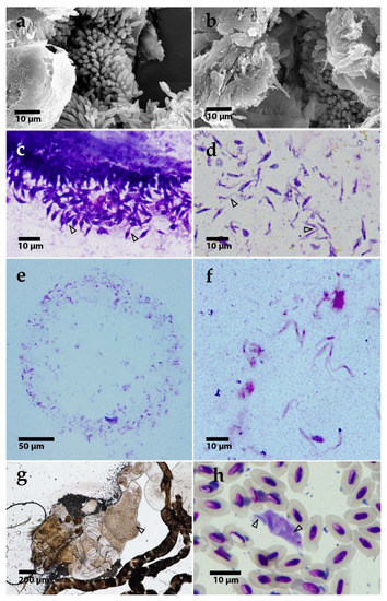 (a,b) Scanning electron microscopy of T. thomasbancrofti OF19 (a) and PAS343 (b) in the gut of Culex quinquefasciatus after experimental infection (c,d). Light microscopy of trypanosome morphotypes in Culex quinquefasciatus gut: rosettes (c) and epimastigotes (d). Prediuresis droplet with numerous trypanosomes (CUL98) (e). A detail of epimastigotes from prediuresis droplet (f). Dissected Culex mosquito gut with trypanosomes after xenodiagnosis; arrowhead pointing to the mass of parasites (g). T. thomasbancrofti trypomastigote from barn swallow (Hirundo rustica) blood with visible striation (see arrows for striation) (h).