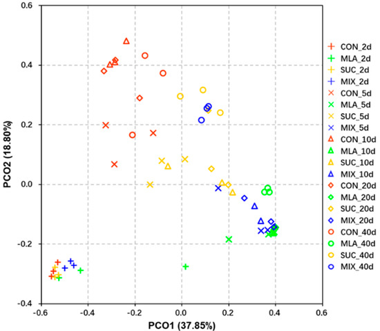 For β-diversity, a principal coordinates analysis (PCoA) was performed, and the results are shown in Figure 1. On the 2nd day of ensiling, no obvious separation was obtained among the four treatments; however, at the 5th, 10th, 20th, and 40th day of fermentation, a remarkable separation was moted between CON and the other three treatments. In addition, significant differences were observed between MLA and SUC, whilst the differences between MLA and MIX on the 5th, 10th, and 20th day were not particularly obvious.