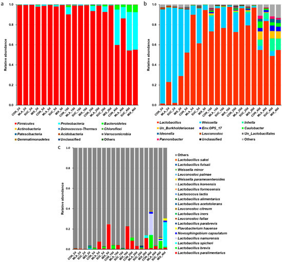 During the 40-day ensiling period, Firmicutes was always the most dominant phylum, accounting for more than 90% of the bacterial community on the 5th, 10th, and 20th day (Figure 2a). As the fermentation proceeded, other phyla increased and included Proteobacteria and Bacteroidetes, especially in CON and SUC. On the 40th day, the relative abundance of Proteobacteria and Bacteroidetes in CON and SUC was higher than that in MLA. At the genera level (Figure 2b), the most dominant phylum on the 2nd day was Weissella, replaced by Lactobacillus on the 5th, 10th, 20th, and 40th day. On the 2nd, 5th, 10th, and 20th day of ensiling, Lactobacillus in CON and SUC was lower than that in MLA and MIX. On the last day, other genera, such as Inhella, unclassified Burkholderiaceae, Env.OPS_17, Caulobacter, and Ideonella, were obtained; however, compared with that in MLA, the relative abundance of Lactobacillus showed a decline. At the species level, the predominant bacteria were L. paralimentarius, L. brevis, L. spicheri, L. namurensis, and Novosphingobium capsulatum (Figure 2c). The amount of L. brevis in MA was particularly low. The relative abundance of L. paralimentarius and L. spicheri was high in MIX, whilst that of L. namurensis was high in CON.