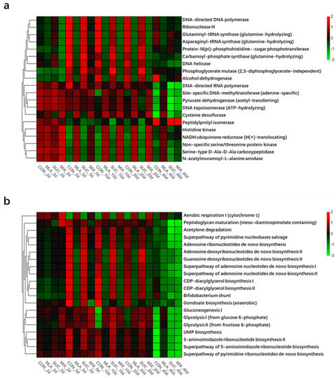 As shown in Figure 3a and Figure S1, the top five predicted functions were DNA helicase, DNA-directed DNA polymerase, Histidine kinase, Non-specific serine/threonine protein kinase, and NADH: ubiquinone reductase (H(+)-translocating). For the predicted pathways (Figure 3b and Figure S2), the top five were Aerobic respiration I (cytochrome c), Acetylene degradation, Superpathway of pyrimidine nucleobases salvage, Peptidoglycan maturation (meso-diaminopimelate containing), and Superpathway of adenosine nucleotides de novo biosynthesis I. The heatmaps of the predicted functions and pathways (Figure 3a,b) implied that the addition of malic acid might have affected the dominant functions and pathways.