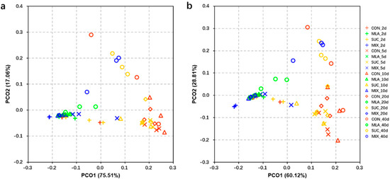Principal co-ordinates analysis (PCoA) plot of predicted functions (a) and pathways (b) of the bacterial communities analyzed via PICRUSt. CON, control group; MLA, 1% malic acid addition on the fresh weight (FW) basis; SUC, 1% sucrose addition on the FW basis; MIX, 1% malic acid and 1% sucrose addition on the FW basis.