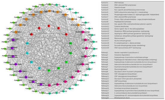 In addition, we analyzed the correlation between dominant bacteria and dominant functions (Figure 5 and Table S2). In detail, p_Firmicutes had a positive correlation with DNA topoisomerase (ATP-hydrolyzing), Pyruvate dehydrogenase (acetyl-transferring), and DNA-directed RNA polymerase (Cor = 0.9325, p = 2.50 × 10−27; Cor = 0.9065, p = 2.22 × 10−23; Cor = 0.8841, p = 8.09 × 10−21, respectively). DNA topoisomerase (ATP-hydrolyzing) had a negative correlation with p_Proteobacteria and p_Bacteroidetes (Cor = −0.9310, p = 4.52 × 10−27; Cor = −0.8996, p = 1.55 × 10−22, respectively). Pyruvate dehydrogenase (acetyl-transferring) was negatively correlated with p_Proteobacteria (Cor = −0.9034, p = 5.43 × 10−23). For the predicted pathways (Figure 5 and Table S3), g_Unclassified_Lactobacillales had a positive correlation with Gondoate biosynthesis (anaerobic) (Cor = 0.8509, p = 7.36 × 10−18). p_Firmicutes was positively correlated with Glycolysis I (from glucose 6-phosphate) and Acetylene degradation (Cor = 0.7812, p = 1.80 × 10−13; Cor = 0.7806, p = 1.93 × 10−13, respectively). p_Proteobacteria was negatively correlated with Acetylene degradation and Glycolysis I (from glucose 6-phosphate) (Cor = −0.7783, p = 2.51 × 10−13; Cor = −0.7757, p = 3.40 × 10−13, respectively). g_Env.OPS_17 had a negative correlation with Peptidoglycan maturation (meso-diaminopimelate containing) (Cor = −0.7725, p = 4.85 × 10−13).