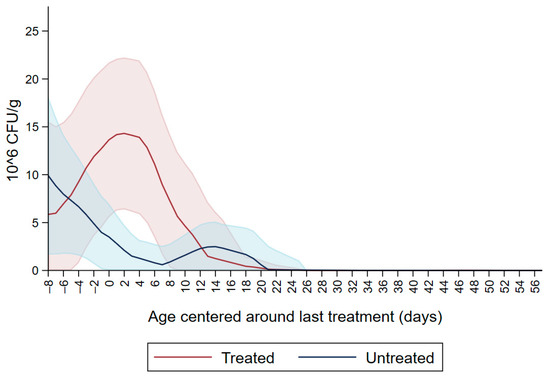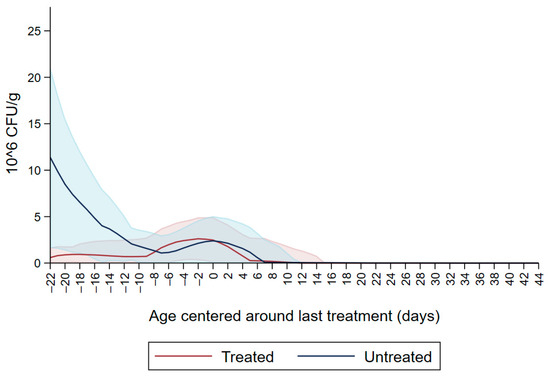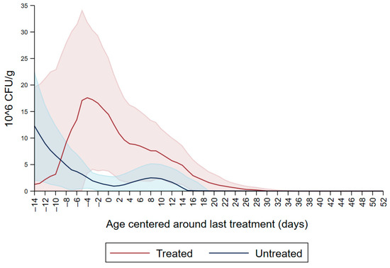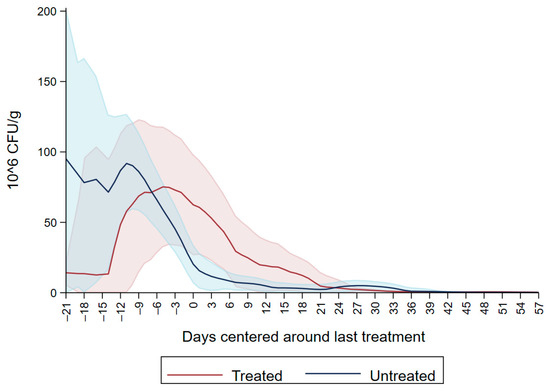 Figure 1 shows the CFU/g of Enterobacteriaceae resistant to ceftiofur 30 µg/mL in untreated calves and calves treated with ceftiofur during the first nine observation days. The x axis shows the age in days centered around the last treatment. The figure shows an increase in CFU/g of Enterobacteriaceae in the ceftiofur treated animals post-treatment, which persists into the following days and eventually declines, while in untreated calves the concentration of Enterobacteriaceae decreases starting on the second day of the study but remains <5 × 106 CFU/g. Figure 2 depicts a similar trend of Enterobacteriaceae concentration in calves that received the ceftiofur treatments 10 to 18 days from enrollment. The peak of resistance corresponds to the calves’ treatment period followed by a decreasing concentration of resistant Enterobacteriaceae in the post-treatment period. Specifically, Enterobacteriaceae concentration started to decrease on day—4 with a dramatical reduction from day 0 (last day of treatment) to day 4 post treatment until reaching a significantly low concentration at approximately day 22 post treatment compared to the last day of treatment. Figure 3 shows the Enterobacteriaceae concentration trend for untreated calves and calves treated with ceftiofur 19 days or more from enrollment. The treated calves Enterobacteriaceae concentration increased during the treatments but remained below 5 × 106 CFU/g followed by a decrease under 1 million CFU/g after six days from the last treatment until the end of the study. Untreated calves had a similar trend in Enterobacteriaceae counts to treated calves in Figure 1, Figure 2 and Figure 3 within a week from last treatment.