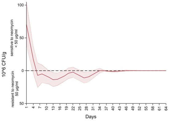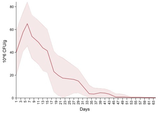 Dairy source and fecal score variables were excluded due to the non-significant variables. The final model is summarized in Table 4, and shows an overall increase in CFU/g on days four to eight, 14 and 18 interlaced with a decrease on days 11, 15 and day 20, producing a cyclical pattern. Subsequently, there were no significant differences in CFU/g between day 22 and 37 compared to the first day of follow up. For the remaining period there was a significant decrease in CFU/g compared to the first day of follow up. Figure 5 depicts the neomycin resistant (50 µg/mL) Enterobacteriaceae concentration increase after the first shot followed by a peak on day 6. Subsequently, there is a decrease in Enterobacteriaceae concentration below 20 × 106 CFU/mL on the last day of treatment (day 20) and a constant decrease until day 64.