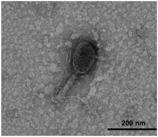 Only one lytic phage was isolated from a slaughterhouse sewage by single plaque isolation from the best clear plaque (Figure S1). This isolated phage was propagated and purified to a final concentration of (1.23 ± 0.18) × 1010 PFU/mL. The phage was named KFS-EC3, according to the nomenclature recommended by Ackermann, that the phage’s name should contain the first two letters of the genus and species of the indicator strain [42]. KFS-EC3 (Figure 1) was revealed to consist of an icosahedral head with a length of 96.35 ± 6.84 nm and width of 86.83 ± 7.52 nm, and a contractile tail of 68.42 to 133.48 nm in length, based on the analysis of 20 different TEM images of KFS-EC3. Thus, KFS-EC3 was shown to belong to the myovirus.