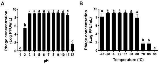 When KFS-EC3 is used as a biocontrol agent in foods, it will be exposed to diverse environmental conditions. Thus, it would be important to study the lytic stability of KFS-EC3 at various pH levels and temperatures. KFS-EC3 exhibited excellent stability at the pH range of 3 to 11, however, its stability was significantly reduced to (5.56 ± 0.03) log PFU/mL and (1.65 ± 0.07) log PFU/mL at pH 2 and 12, respectively, from ~9.10 log PFU/mL (p < 0.05) (Figure 3A). In addition, it lost almost all infectivity at pH 1 with a reduction to (0.09 ± 0.01) log PFU/mL. Furthermore, KFS-EC3 exhibited robust stability at a broad temperature range between −70 °C and 60 °C (Figure 3B). Afterwards, its stability significantly decreased to (1.67 ± 0.39) log PFU/mL at both 70 °C and 80 °C, and its lytic activity was completely lost at 90 °C (p < 0.05).