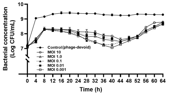 An overnight culture of E. coli O157:H7 ATCC 10536 was added into 100 mL of fresh TSB medium (2% inoculum, v/v) and incubated at 37 °C with gentle shaking until it reached 0.5 of OD640nm (~8 log CFU/mL). Afterwards, KFS-EC3 was diluted using SM buffer and added to the bacterial suspension at a 1:1 volume ratio to attain an MOI of 10, 1.0, 0.1, 0.01, and 0.001. The suspension was then incubated at 37 °C for 64 h with gentle shaking, and the viable bacteria number was counted at every 4 h interval using TSA plates.