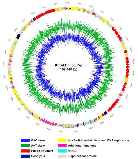 The sequencing of the KFS-EC3 genome produced 20,866,184 reads, which were trimmed to 18,852,944 reads. According to the de novo assembly, KFS-EC3 consisted of 167,440 bp with a 35.5% GC contents (Figure 5). In the analysis of annotation and visualization, a total of 273 ORFs and 8 tRNAs were predicted in the KFS-EC3 genome (Figure 5). Among these predicted 273 ORFs, 151 ORFs (55.68%) were annotated and organized into four functional groups, including constructing phage structure (the baseplate, neck, tail, tail fiber, and capsid protein), cell lysis (holin and lysozyme), nucleotide metabolism and DNA replication (terminase, RNA polymerase, DNA helicase, DNA polymerase, exonuclease, DNA ligase, and DNA helicase), and additional functions (glutaredoxin, thioredoxin, and phospholipase). In contrast, 122 ORFs (44.69%) were assumed to be hypothetical proteins with unknown functions due to the absence of identical genes in the NCBI database. More importantly, KFS-EC3 did not contain any genes associated with virulent factors from the database of VirulenceFinder-2.0 [34], antibiotic resistance from the databases of CARD [35] and ResFinder 2.1 [36], lysogenic activity from PHASTER’s database [37], or allergenicity from the allergen database (http://www.allergenonline.com, 5 May 2021). Overall, the genetic analysis suggests that KFS-EC3 would be a safe biocontrol agent for food application.