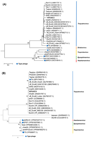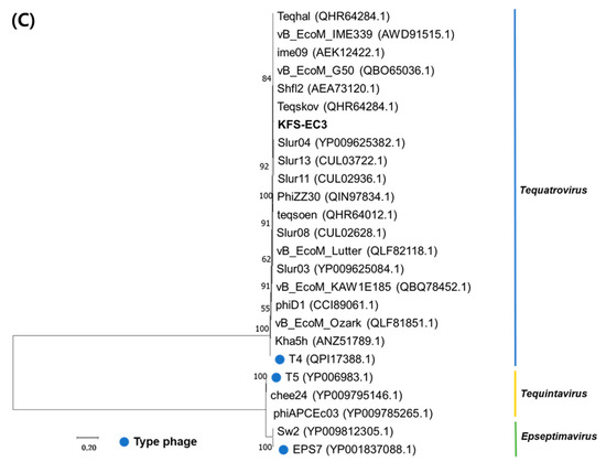 The classification of KFS-EC3 was confirmed by phylogenetic tree analysis on the basis of the complete genome and major capsid protein [44]. From the complete genome, KFS-EC3 was clustered with ten phages of the Tequatrovirus genus including slur13, slur04, slur11, teqhal, teqsoen, Kha5h, Shfl2, ime09, vB_EcoM_IME339, and vB_EcoM_G50 (Figure 6A). With respect to the phylogenetic analysis based on capsid protein, KFS-EC3 was located in a single branch with eight Tequatrovirus phages (Figure 6B). Thus, considering the genetic relationships, this phage belongs to the Tequatrovirus genus of the Myoviridae family. Based on the large subunit of terminase, the phylogenetic analysis revealed that KFS-EC3 was clustered with teqhal, vB_EcoM _IME339, ime09, vB_EcoM_G50, Shfl2, and teqskov, suggesting a common DNA packaging process (Figure 6C). A total of 26 phages were selected based on ICTV and NCBI databases for heatmap analysis of the ANI value, including 19 Tequatrovirus phages, 3 Tequintavirus phages, 2 Epseptimavirus phages, and 1 Haartmanvirus phage. The heatmap and ANI analysis showed that KFS-EC had close relatedness with the other phages of a common cluster at the nucleotide level, and it was particularly similar to ime09 (97.13%), vB_EcoM_G50 (96.1%), and vB_EcoM_IME399 (96.04%), as shown by their ANI values that were above 96% (Figure 7). To further investigate the novelty of KFS-EC3, its genome was compared with that of vB_EcoM_IME399, which showed high similarity in all analyses, and with that of T4 phage, which is type phage of Tequatrovirus (Figure 8). The comparative analysis revealed that the genes of KFS-EC3 maintained a conserved gene orientation. The major difference between KFS-EC3 and the other phages was the low sequence similarity (<80%) of the tail protein (Figure 8B). Overall, these findings confirm that KFS-EC3 is distinctly genetically different from previously identified phages, and it was therefore classified into the Tequatrovirus genus of the Myoviridae family as a new phage.