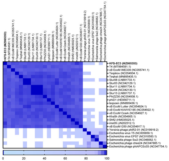 Heatmap analysis of the average nucleotide identity values of KFS-EC3 and other related phages in the NCBI database. Deeper shades of blue indicate a closer relationship.