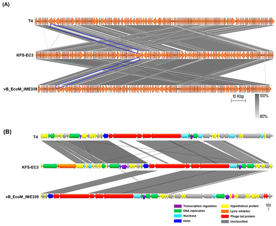 Genomic comparative analysis of KFS-EC3 (middle), Escherichia phage T4 (top), and E. coli phage vB_EcoM_IME339 (bottom). Gene clusters whose translated products shared low similarity were indicated using blue boxes. (A) Complete genome of the three phages visualized using Easyfig. (B) Boxed gene clusters at high magnification. Homologous regions were indicated by gray shading in figures.
