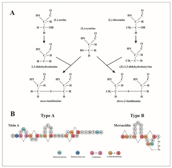 Lantibiotics are low molecular weight RiPPs which contain unusual dehydroamino acids such as the thioether amino acids lanthionine (Lan) and/or β-methylanthionine (MeLan) and various other modified residues, such as α,β-unsaturated amino acids 2,3-didehydroalanine (Dha) and 2,3-didehydrobutyrine (Dhb) resulting from the dehydration of serine and threonine residues, respectively. They can next form thioether β-carbon linkages with cysteines (Figure 2A) [44]. These unusual amino acids play an important role in the rigidity of the peptide and its resistance to proteolytic degradation and to heat treatment [47].