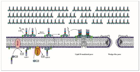 Scheme showing the mechanism of action for lantibiotic bacteriocins, mainly forming a pore into the target membrane by electrostatic interaction (wedge-like pores) or by binding to lipid II. Lipid II is formed in two steps: (i) the UDP-N-acetylmuramyl-pentapeptide is linked to the undecaprenyl phosphate by the enzyme MraY to obtain the lipid I; (ii) then, a unit of N-acetylglucosamine is linked to the N-acetylmuramyl by the enzyme MurG to obtain the final lipid II. After its formation, the lipid II is translocated across the membrane to the outer side, and oligomerized to form the cell wall. The cationic type-A lantibiotics (like nisin, depicted in the figure) can form a target-mediated pore using lipid II as a docking molecule. In addition, the hijacking of lipid II molecules for the formation of pores in the membrane can destabilise the formation of the wall, thereby weakening it.