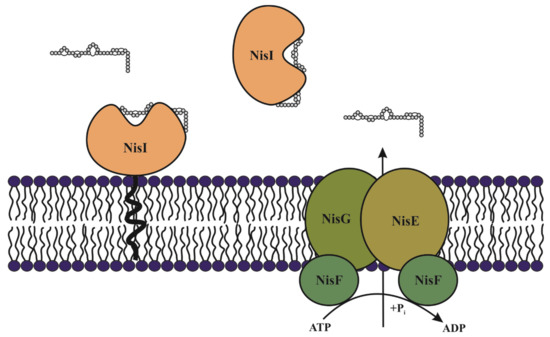 Nevertheless, it has been established that Lactococcus lactis nisin producing strains are able to prevent the deleterious effects of its own nisin by using two distinct cooperative mechanisms. The first is related to expression of the specific NisI immunity protein, which is a lipoprotein able to bind to nisin, and thereby prevents it from accessing its predicted target lipid II (Figure 4) [78]. The second mechanism involves the ATP-binding cassette transporter NisFEG, which expels nisin outside of the membrane prior to pore formation [79,80]. These mechanisms involving NisI and NisFEG were among the first reported, since full immunity was only observed in the presence of both proteins (Figure 4) [81]. Moreover, other studies also showed the influence of both systems, and reported immunity levels of 5–20% for each mechanism [81,82]. A modification of the lipid profile allowed the anchoring of NisI extracellular side of the membrane, but a lipid-free form of the NisI also exists, secreted into the surrounding medium, and both forms were shown to bind nisin [79,83]. NisFEG seemed to recognize the C-terminal domain of nisin since deletion of the last six amino acids and last ring lowered the degree of immunity displayed by NisFEG [84]. Nevertheless, knowledge of the physiology and regulation of genes involved in this self-immunity is limited. Involvement of other genes in nisin immunity through direct or indirect interactions has been reported by Zhu et al. [85]. These authors established that the Mu-transposon occurring within the chromosomal feuD gene in L. lactis N8 provided a derivative strain L. lactis L58 with an enhanced nisin immunity system. Interestingly, the gene cluster feuABCD encoding for an ATPase of the ABC-type cobalamin/Fe3+ siderophores transporter FeuABCD including FeuD has been observed in many bacterial species [86]. This result suggested that FeuD was a component of transporter FeuABCD.