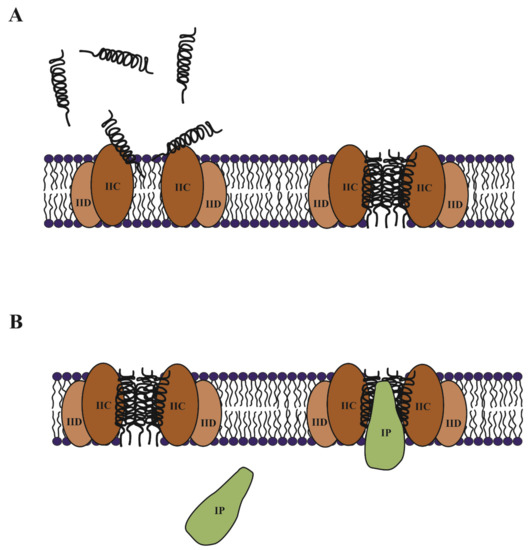 Model of the mechanism of action and immunity for the class IIa bacteriocin, based on the suggestions from enterocin CRL35 [125]. (A) The bacteriocin reaches the membrane via interaction with EIIC protein of maltose PTS transporter (EIIC and EIID components). Then, the peptides organize themselves to form the pore. (B) The immunity protein (IP) is a soluble cytosolic protein, which interacts with the complex bacteriocin-receptor plugging the formed pore, avoiding cell death.