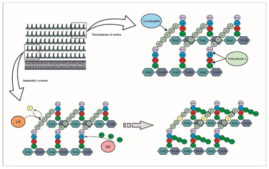 Depending on the nature of the lytic bacteriocin, the target may be either in the stem peptide, or in the interpeptide bridge, or both. Enterolysin A cleaves interpeptide bonds inside peptidoglycan units at two sites depending on the target strains. In L. monocytogenes NCTC 10884, S. aureus NCTC 4163 and E. faecalis No. 40, the cleavage occurs within the stem peptide between L-alanine and D-glutamic acid, whereas in L. helveticus, L. casei, L. delbrueckii ssp. bulgaricus, P. pentosaceus, L. lactis ssp. lactis, L. lactis ssp. cremoris and L. helveticus strains the cleavage occurs between the L-lysine of the stem peptide and the D-aspartic acid of the interpeptide bridge. It was reported that when enterolysin A cleaved within the peptide bridge between L-alanine and D-glutamic acid, the antimicrobial activity observed was significantly higher (Figure 6) [147].