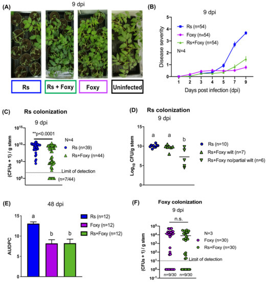 2.1. Bacterial Wilt Severity Is Significantly Reduced in Co-Infections