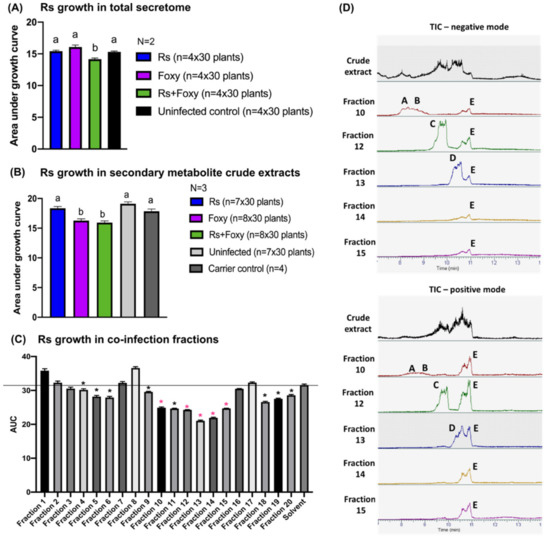 Crude extracts from the co-infection secretome reduce in vitro R. solanacearum growth. (A) shows area under growth curve (AUC) for 42 h post inoculation (hpi). R. solanacearum was inoculated in total secretome (including plant and microbial secretions) from different treatments as indicated. Bacterial growth in co-infection secretome was significantly reduced compared to secretomes from single infections (ANOVA p = 0.0003; Rs vs. Rs+Foxy—Tukey’s p = 0.0049; Foxy vs. Rs+Foxy—Tukey’s p = 0.0001). (B) shows R. solanacearum growth as AUC up to 48 hpi in crude extracts eluted into ethyl acetate. ANOVA p < 0.0001. Rs vs. Rs+Foxy—Tukey’s p = 0.0005; Foxy vs. Rs+Foxy—Tukey’s p = 0.9260. (C) Co-infection crude extract was fractionated and R. solanacearum growth was quantified in each fraction. ANOVA p < 0.0001. Bonferroni correction was performed to compared AUCs between each fraction with the solvent control *p < 0.05. The fractions marked in pink * (p < 0.0001) were chosen for further analyses in (D) and Figure 4. (D) Total ion chromatograms (TIC) of the fractions in positive and negative modes run on HR-ESI-MS. The m/z of these peaks (A–E) are reported in Table S1.