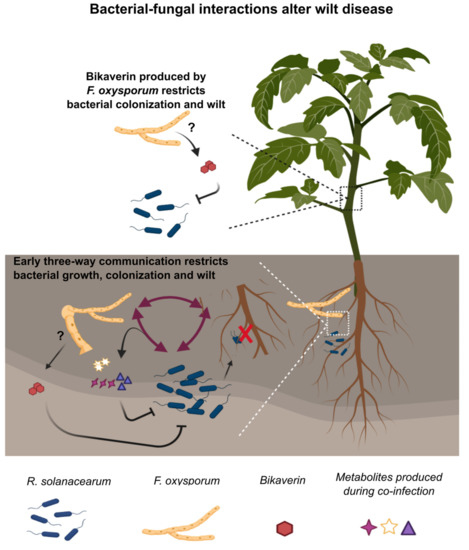The following are available online at https://www.mdpi.com/article/10.3390/microorganisms9102123/s1, Figure S1: Schematic for co-infection of tomato seedlings, Figure S2: R. solanacearum growth is not inhibited in in vitro co-cultures, Figure S3: Reduction in bacterial wilt during co-infection requires active and specific interactions with F. oxysporum f. sp. lycopersici, Figure S4: A timeline for F. oxysporum infection, Figure S5: Assessment of R. solanacearum attachment to roots, Figure S6: bik1 knockout construction and validation. (A) Genomic context for bik1 gene in F. oxysporum, Figure S7: Co-culture of R. solanacearum and F. oxysporum in secretome collection buffer does not inhibit bacterial growth, Figure S8: The bioactive molecules in the co-infection secretome do not degrade with heat, Figure S9: R. solanacearum growth in secondary metabolite crude extracts eluted into hexane (A) and methanol (B), Figure S10: Untargeted metabolomic analyses of crude extracts from single and co-infected secretomes, Table S1: m/z values for compounds shown in the chromatograms from Figure 4D, Table S2: List of strains used in the study, Table S3: List of primers used in the study.