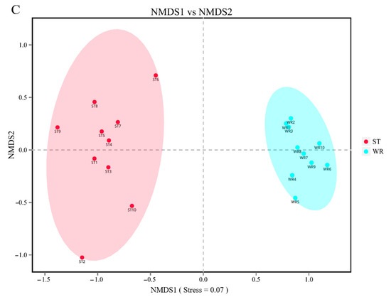 The results of the two-dimensional NMDS analysis at the level of OTUs. (A) The diversity analysis of habitats and fish intestines samples and (B) the diversity analysis of interindividual including HI, LI. and MI. (C) the diversity analysis of habitats including ST and WR. HI, T. houdemeri intestines; LI, H. leucisculus intestines; MI, O. mossambicus intestines; ST, sediment; and WR, water.