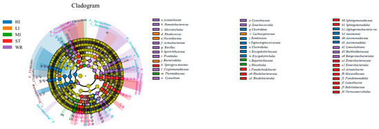Linear effect size (LEfSe) analysis identified the most differentially abundant taxa (p < 0.05, LDA values > 4) in intestines, water, and sediment. Differentially abundant taxa of each group were distinguished by different colors (blue, orange, green, red and purple represented for HI, LI, MI, ST and WR., and yellow for non-significant). Inside-out radiating circles represent taxonomic levels from phylum to genus. HI, T. houdemeri intestines; LI, H. leucisculus intestines; MI, O. mossambicus intestines; ST, sediment; and WR, water.